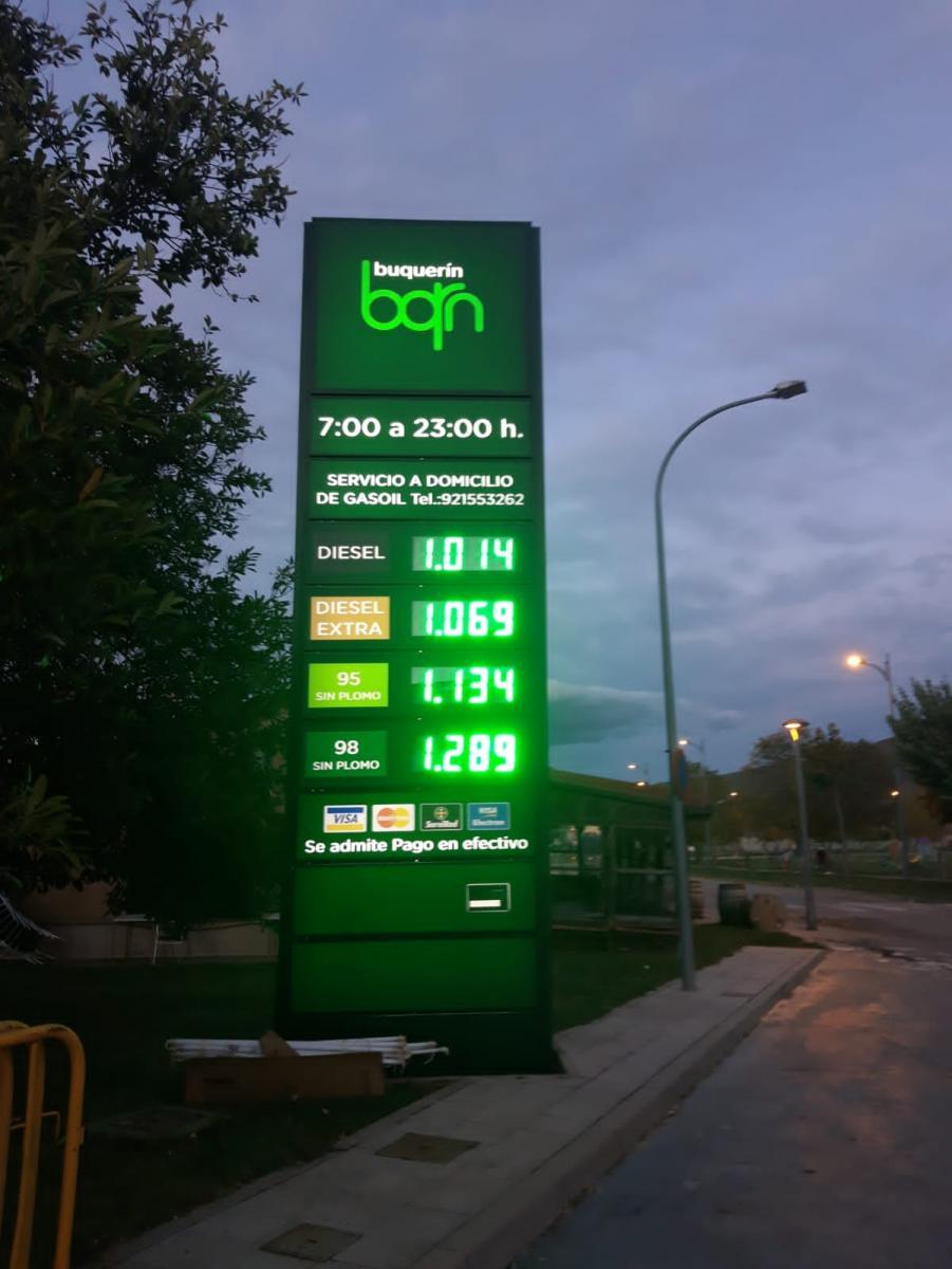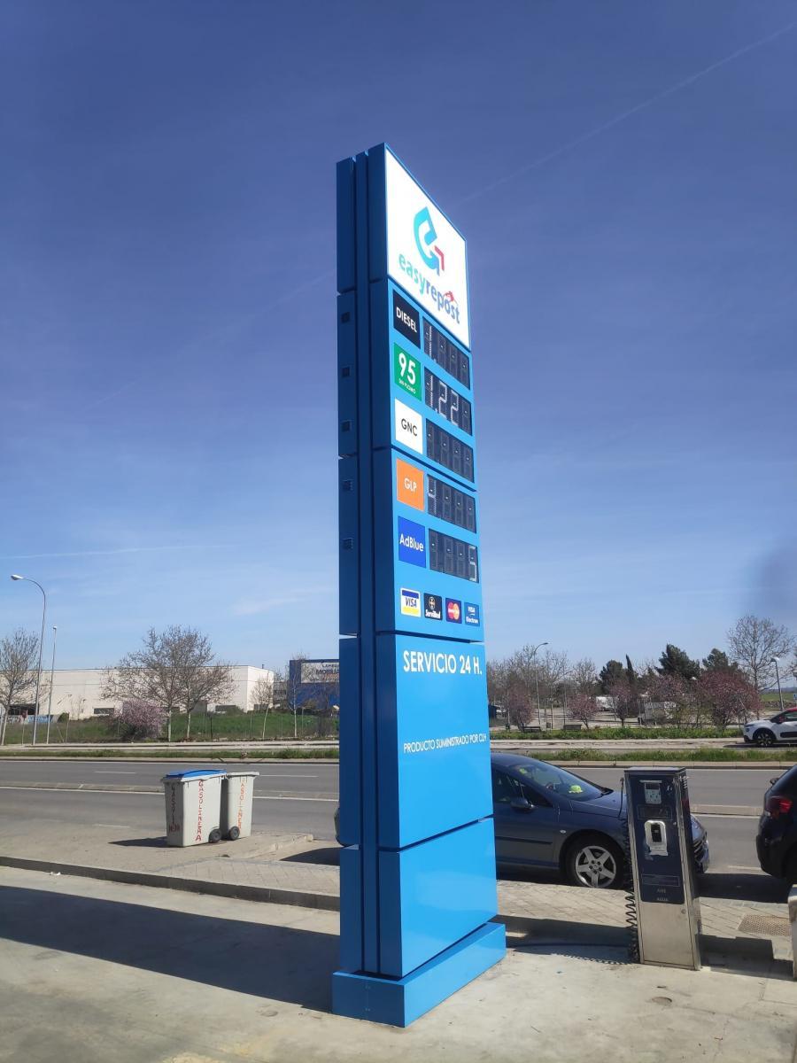 Nuestros monolitos se fabrican a medida, no son estándar y se realizan interiormente con estructuras metálicas con tubos estructurales y los revestimientos mediante paneles de aluminio lacados al horno o bien en panel composite (dibon, alucobond..) para darles mayor rigidez y para obtener una mayor duración al tiempo, calados al frente para los textos y para alojar las pantallas leds de precios. Iluminados interiormente siempre con leds de alta calidad para exterior con convertidores de primeras marcas.